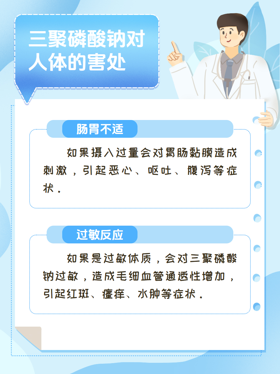 首先,我们要明白,任何东西过量都有可能带来问题。三聚磷酸钠也不例外。如果你吃了太多含有这种添加剂的食物,可能会导致一些消化问题,比如肚子痛、腹泻等。