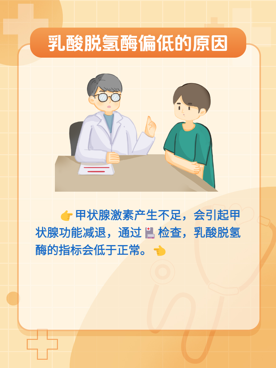 前几天有一位甲状腺功能减退的患者来医院复查,通过一系列的相关检查后,发现乳酸脱氢酶的指标有点偏低,那么这种情况说明什么呢?患者表示很疑惑,不知道这个是什么意思,于是,针对他的困惑,我给出了详细解答👇。