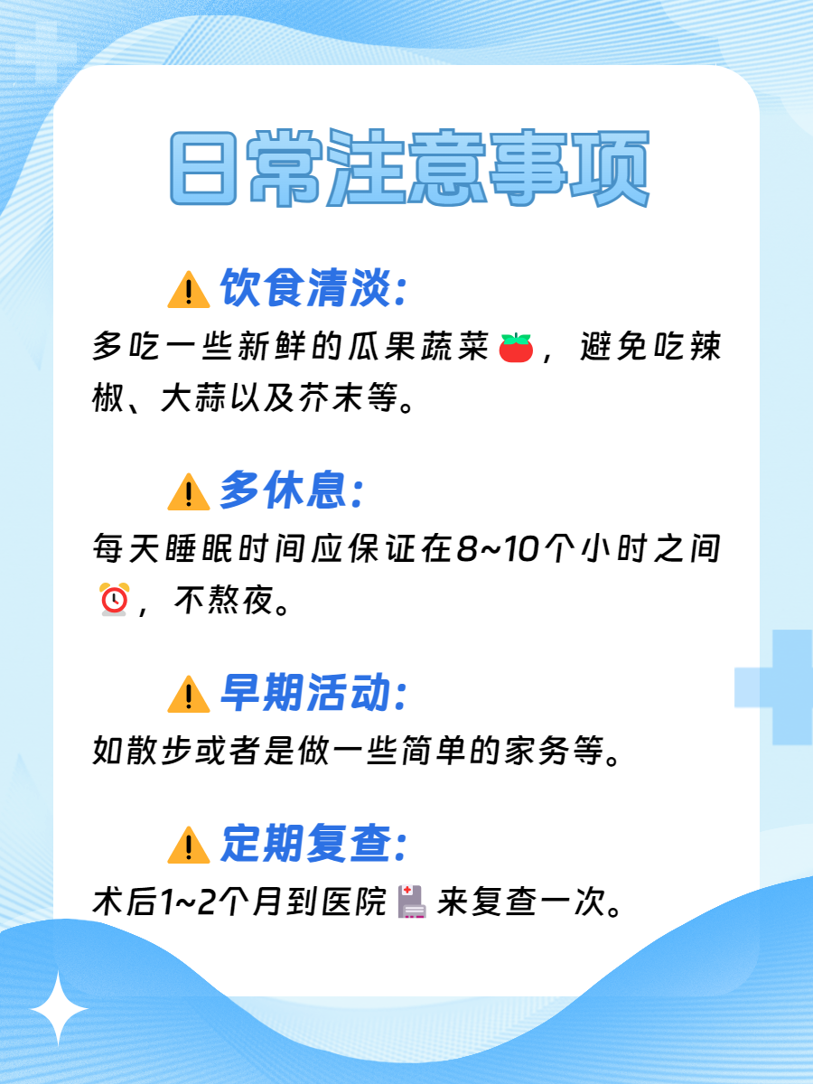 ⚠️2、多休息:患者在术后还需要注意多休息,每天睡眠时间应保证在8~10个小时之间⏰,不可以过度熬夜,以免影响肾脏恢复。