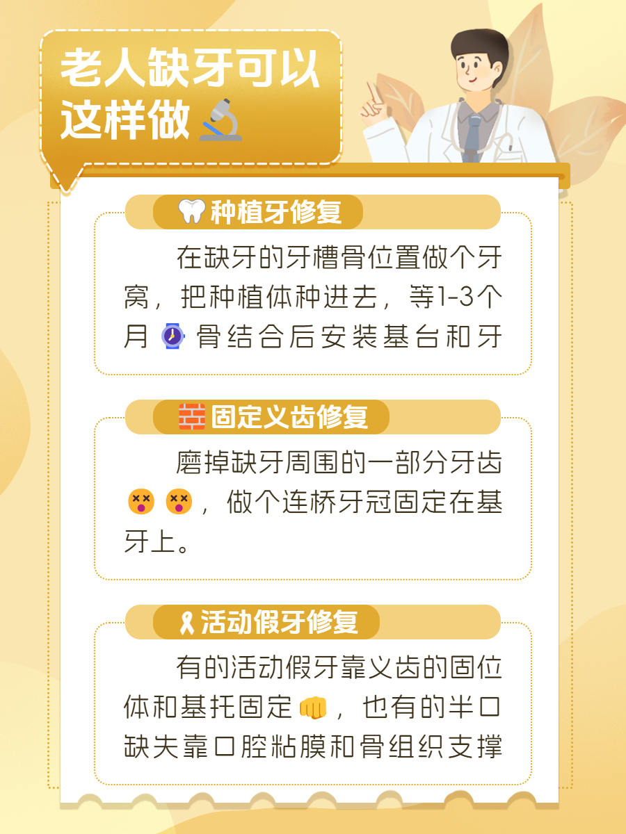 🧱固定义齿修复:也就是固定镶牙,适合部分牙齿缺失的老人。医生会磨掉缺牙周围的一部分牙齿,然后做个连桥牙冠固定在基牙上,就修好啦~