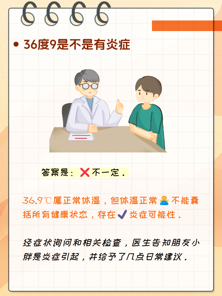 为了搞清楚咋回事,我拽着他去看了医生。医生得知我们来意,首先告诫了这么一句:体温36.9℃不能代表一定就有炎症,但也不能排除炎症。毕竟36.9℃仍然属于正常的体温,但体温正常不能囊括所有的健康状态,有的患者即使是正常体温,也存在炎症的可能性。