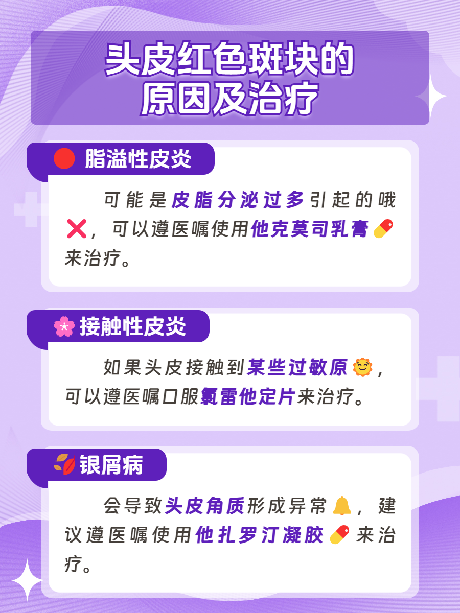 1、🔴 脂溢性皮炎:是不是经常感觉头皮油腻腻的?那可能是皮脂分泌过多引起的哦!这种油脂过多的情况,容易让头皮发炎,形成鲜红色或黄红色的斑块,还会痒痒的,真是让人难受啊!可以遵医嘱使用他克莫司乳膏、维生素B6片等药物治疗。