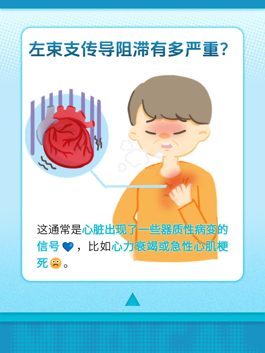 🌟严重:但如果你开始觉得心悸、胸闷或气短,那就得警惕了!这可能是左束支传导阻滞影响到心脏生理功能的表现。这个时候,一定要及时就医,让专业医生来帮你解决问题哦!