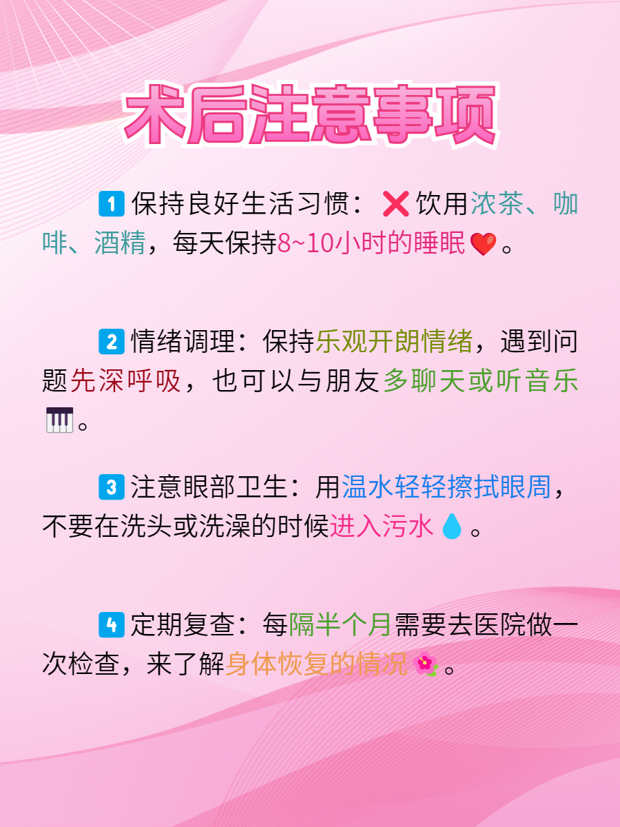 1️⃣、保持良好生活习惯:手术后首先要注意,不要饮用浓茶、咖啡、酒精,这些可能会刺激创面。另外要合理作息,每天睡眠要充足,尽量保持在8~10小时之间,而且不能看强光。