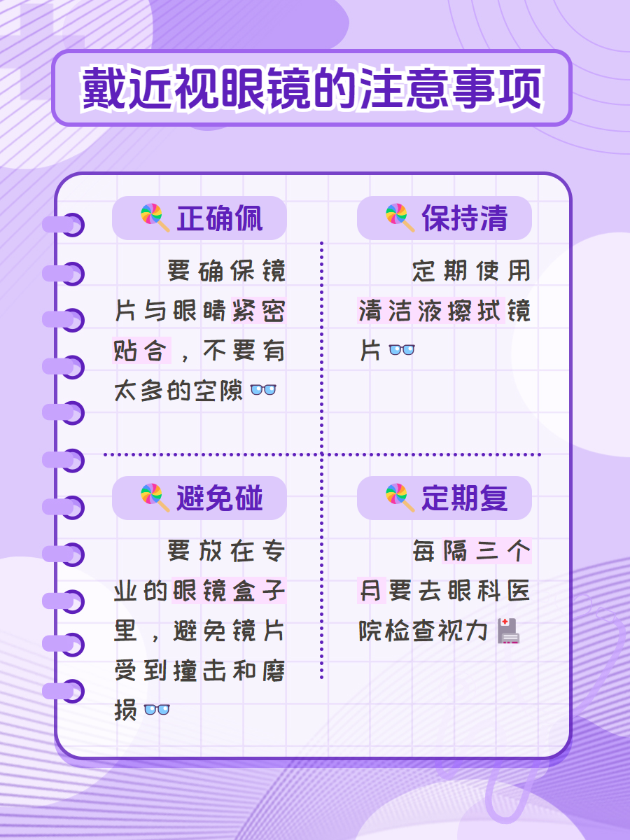 🍭1、正确佩戴:在戴近视眼镜时,要确保镜片与眼睛紧密贴合,不要有太多的空隙,避免影响正常的功能。