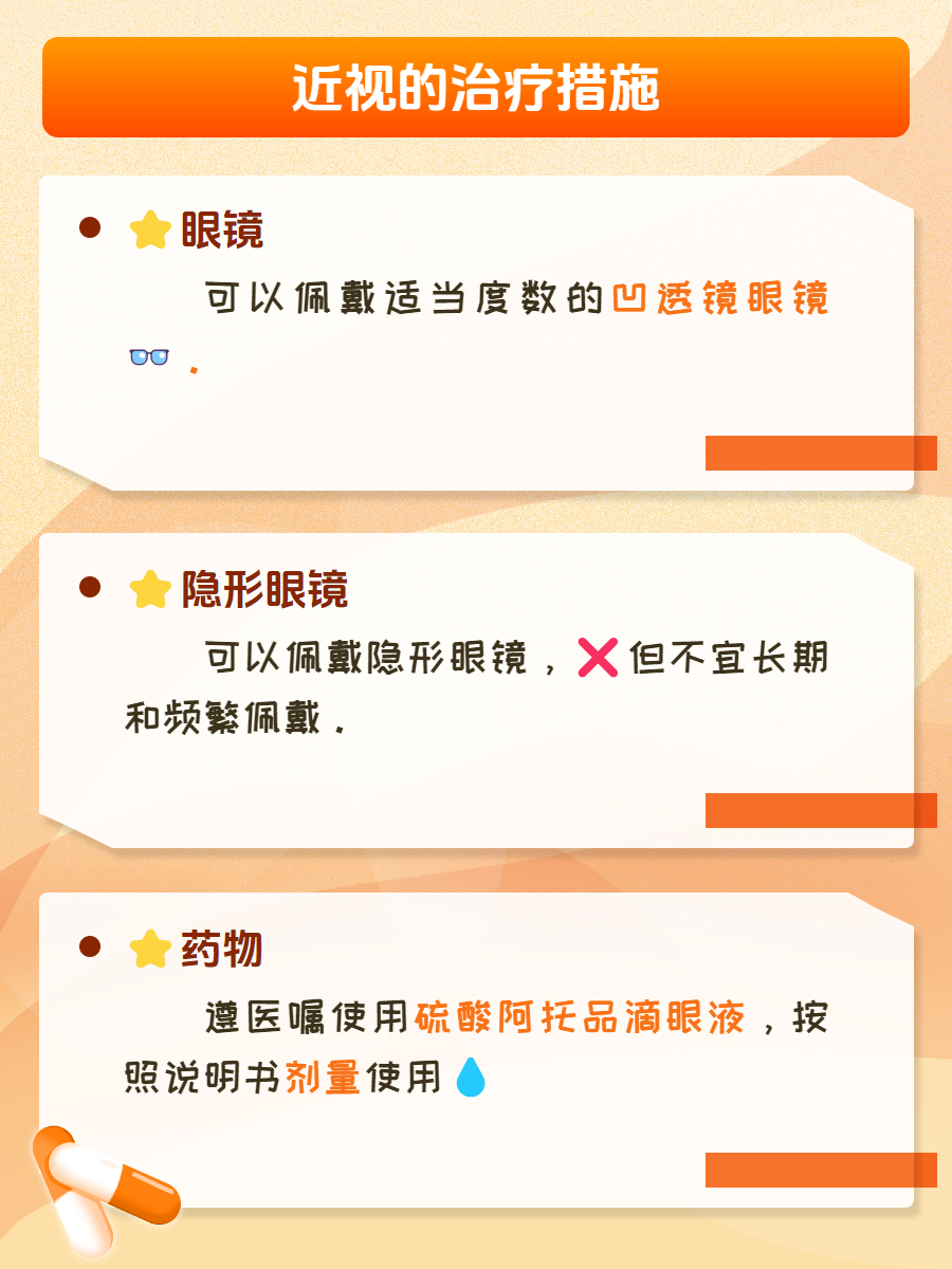 ⭐️1、眼镜:可以通过镜片来矫正视力,能够将光线正确的聚焦在视网膜上,可以看清楚远处的物体。可以佩戴适当度数的凹透镜眼镜。