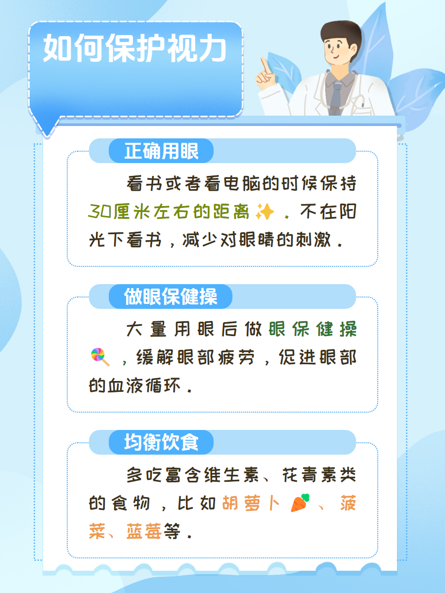 看书或者看电脑的时候,保持30厘米左右的距离。不在阳光下看书、看电脑和手机的时候亮度调低一些,减少对眼睛的刺激。每隔一小时休息一下,比如闭上眼睛或者看远处放松几分钟,对眼部疲劳有缓解。