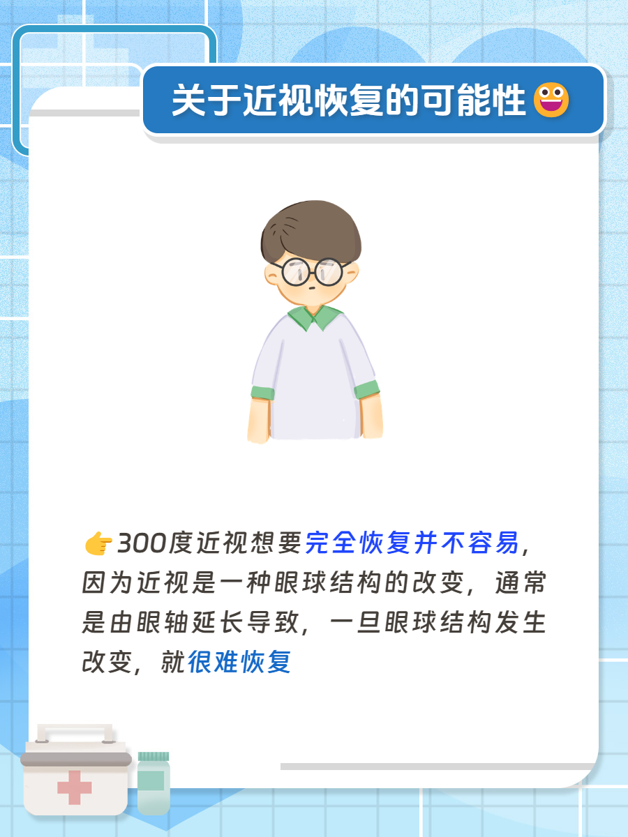 我告诉他300度近视想要完全恢复并不容易,因为近视是一种眼球结构的改变,通常是由眼轴延长导致,一旦眼球结构发生改变,就很难恢复。但是通过手术治疗,可以在一定程度上改善近视的状况,比如激光手术、角膜塑形术等。
