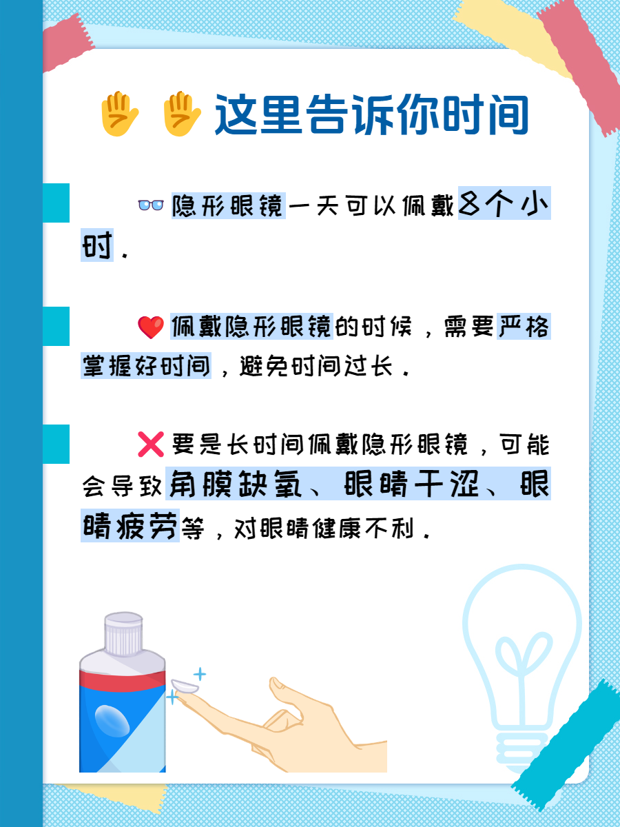 👉我告诉她,隐形眼镜一天可以佩戴8个小时,我们在佩戴隐形眼镜的时候,需要严格掌握好时间,避免佩戴的时间过长。要是长时间佩戴隐形眼镜,可能会导致角膜缺氧、眼睛干涩、眼睛疲劳等,对眼睛健康不利。