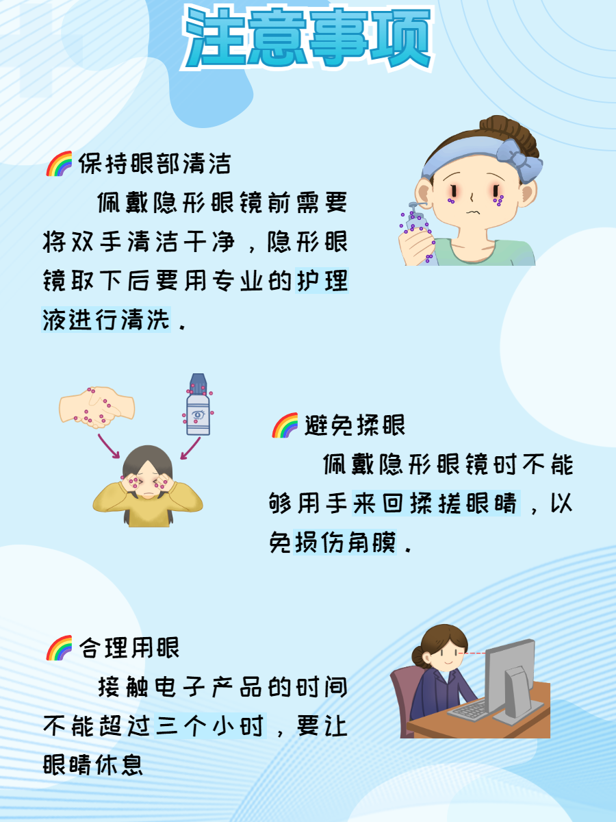 🌈2、避免揉眼:我叮嘱李小姐佩戴隐形眼镜的时候,不能够用手来回揉搓眼睛,以免损伤角膜组织。