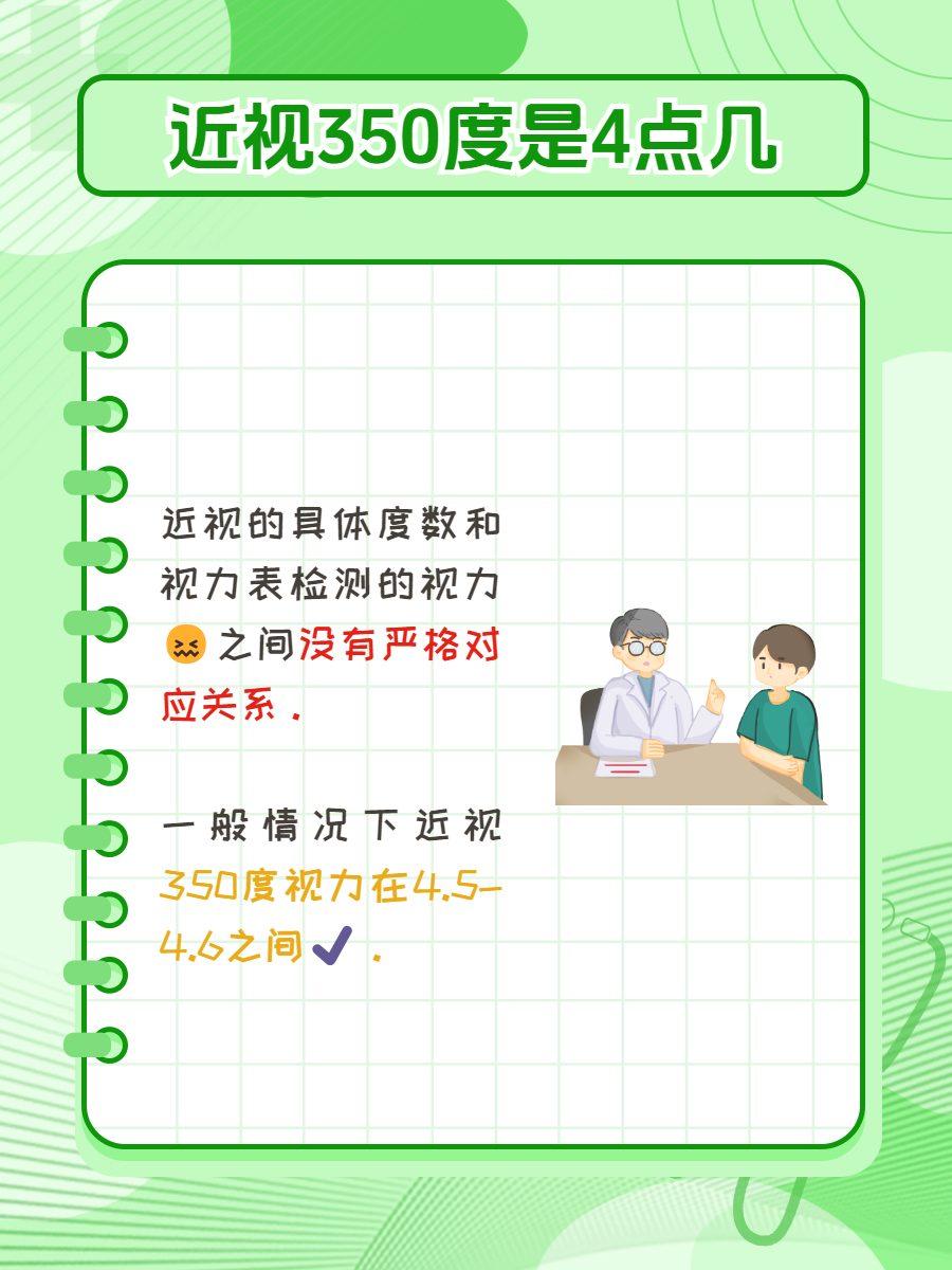 其实近视的具体度数和视力表检测的视力之间是没有严格的对应关系的,因为每个人的眼睛肌肉调节能力不同,相同的屈光状态下视力也会有所不同,所以一般情况下近视350度视力在4.5-4.6之间。