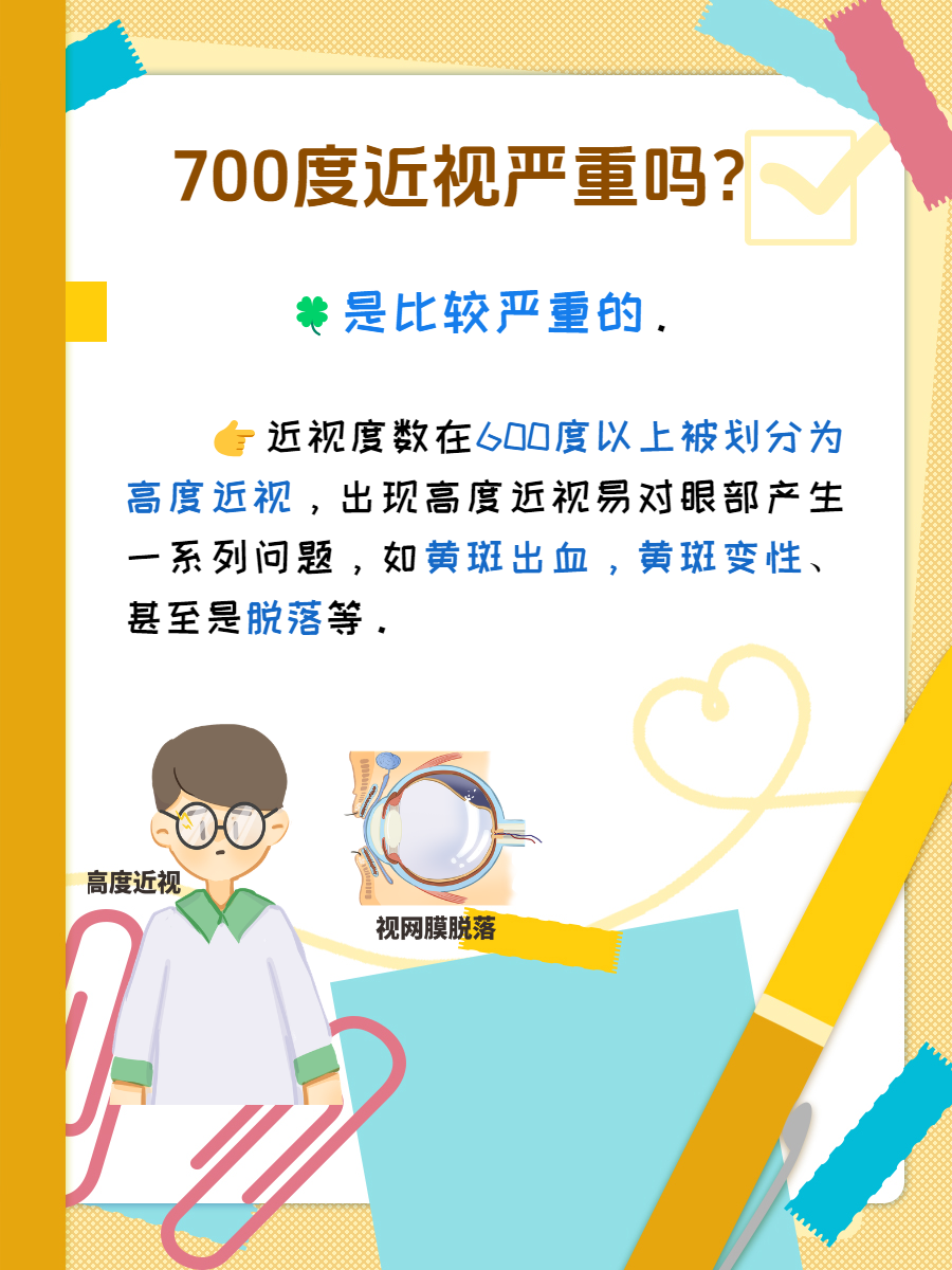 我告诉他:🍀你的这种情况是比较严重的,因为近视度数如果在600度以上就被划分为高度近视了,而出现高度近视的时候,也容易对眼部产生一系列的问题,比如黄斑出血,黄斑变性、视网膜变薄,甚至是脱落等。