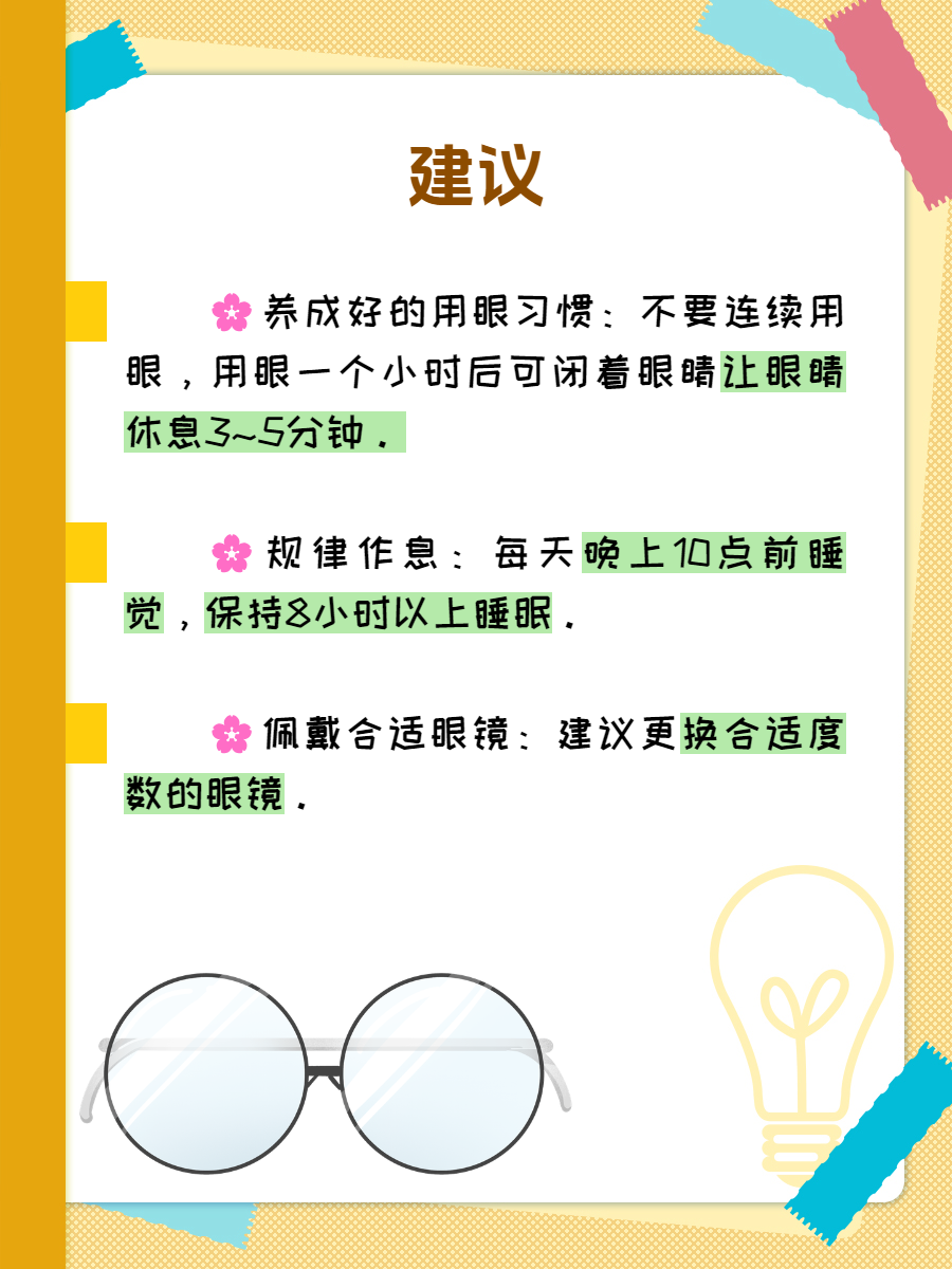 🌸3、佩戴合适眼镜:在检查的过程中,我发现他原来佩戴的眼镜已经不适合他现在的度数,建议他更换合适度数的眼镜。