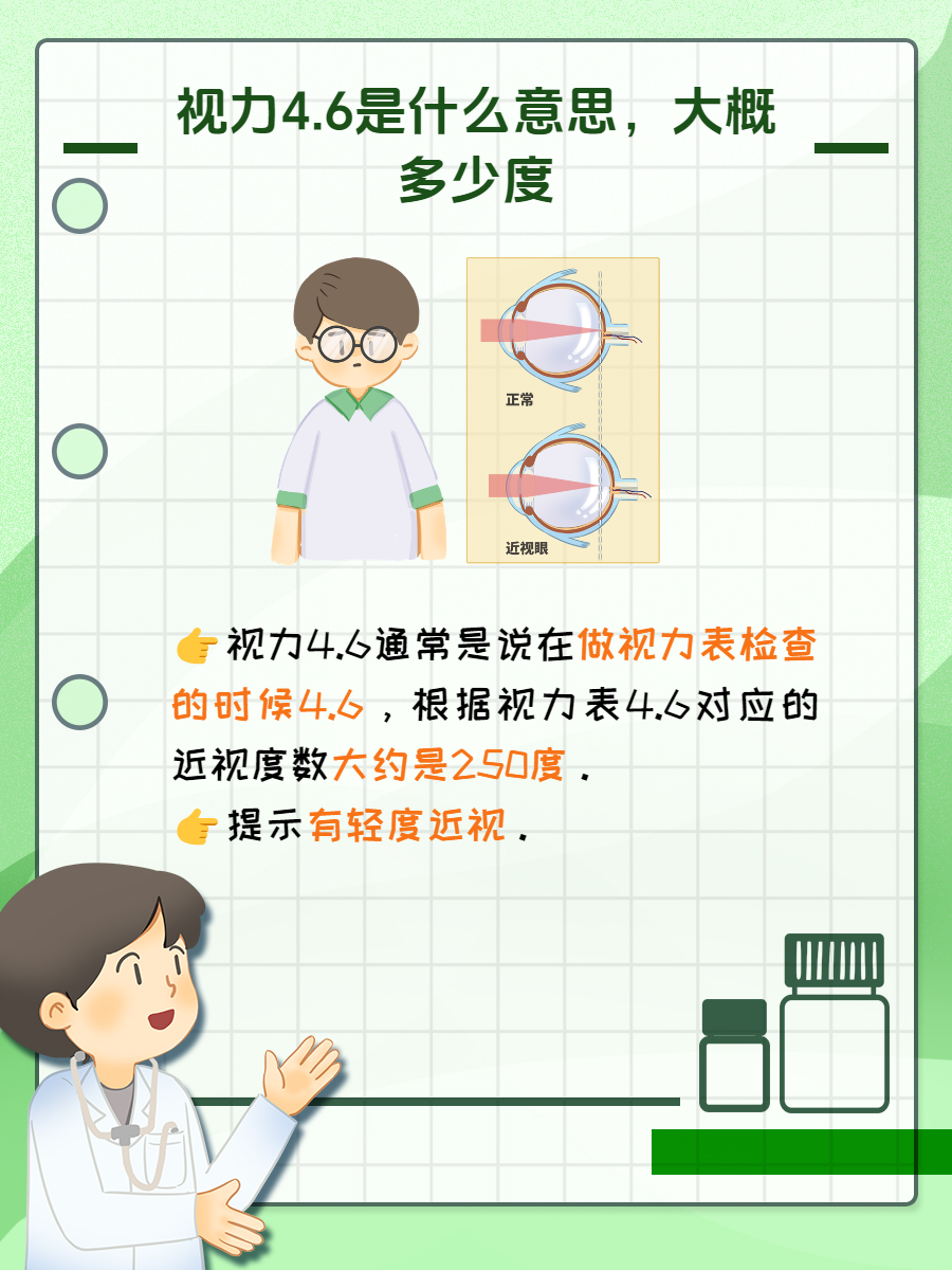 我告诉他:“👉视力4.6通常是说在做视力表检查的时候4.6,根据视力表4.6对应的近视度数大约是250度,这也提示你有轻度近视。”