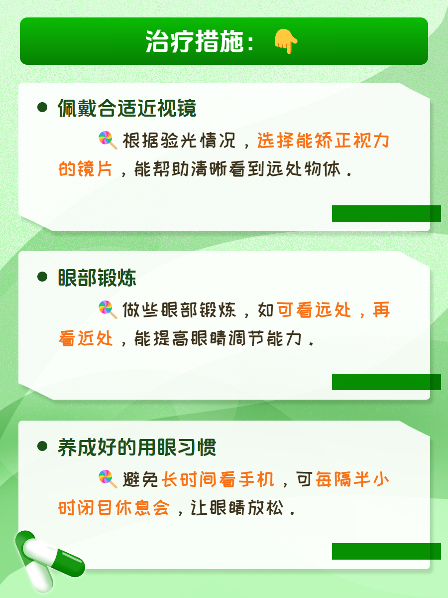 🍭2、眼部锻炼:我告诉他,在平时也可以做些眼部锻炼,比如可以看看远处,再看看近处,这样交替着看,也能提高眼睛的调节能力。
