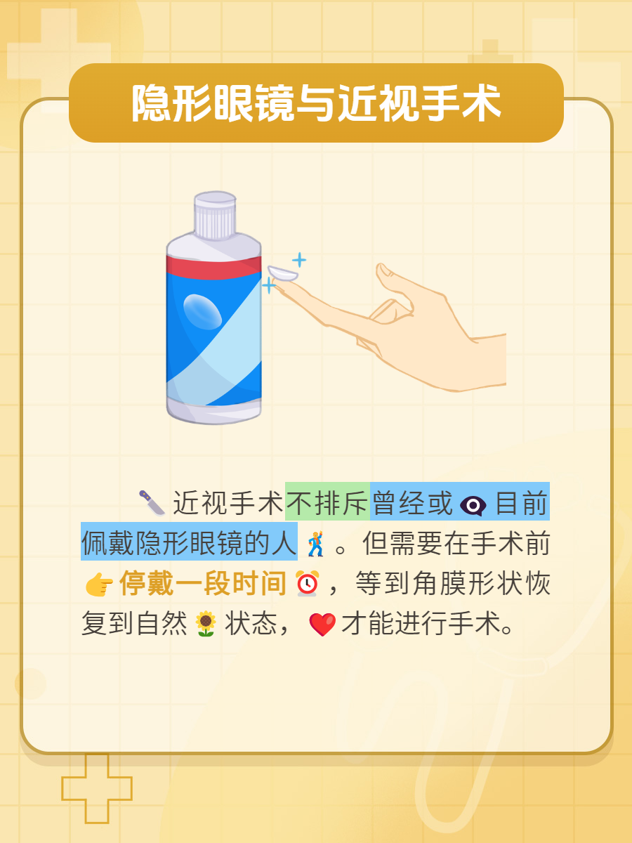 前段时间一到诊室就有一个患者问我,你好医生,我正在考虑做近视眼手术,但又担心自己戴隐形眼镜会不会有影响,心里非常矛盾,所以特意来向您咨询。🥼我听到患者的问题后连忙回答道,近视手术不排斥曾经或目前佩戴隐形眼镜的人,但是戴隐形眼镜会对眼睛的角膜形状产生影响😖,所以需要在手术前停戴一段时间,等到角膜形状恢复到自然状态才能进行手术✔️。