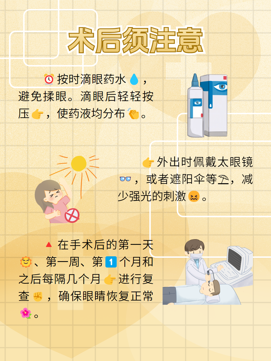 🌅3、定期复查:按照医生的建议,⏰可能需要在手术后的第一天、第一周、第一个月和之后每隔几个月进行复查,便于及时发现问题,及时调整治疗方案,确保眼睛恢复正常。