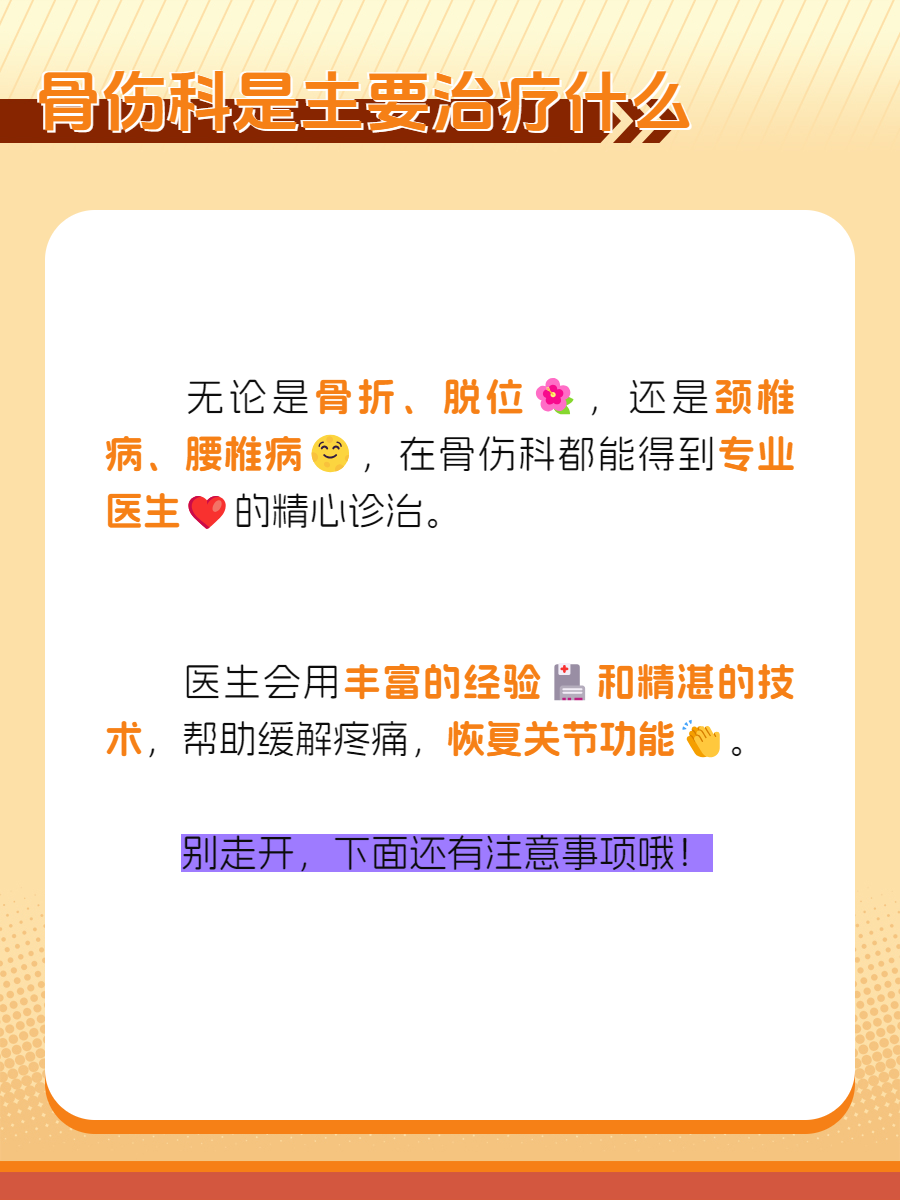 👩⚕️💪医生告诉我,骨伤科,顾名思义,就是专门治疗各种骨骼和关节问题的科室啦!无论是骨折、脱位,还是颈椎病、腰椎病,又或者是类风湿性关节炎、强直性脊柱炎这些风湿病和免疫科的疾病,都能得到专业医生的精心诊治。他们会用丰富的经验和精湛的技术,帮助你缓解疼痛,恢复关节功能,重新找回健康与活力!