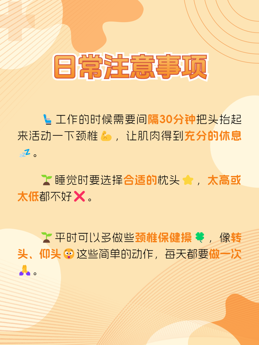 🌱平时可以多做些颈椎保健操,像转头、仰头这些简单的动作,每天都要做一次,10~15分钟即可,能有效缓解颈椎的疲劳。