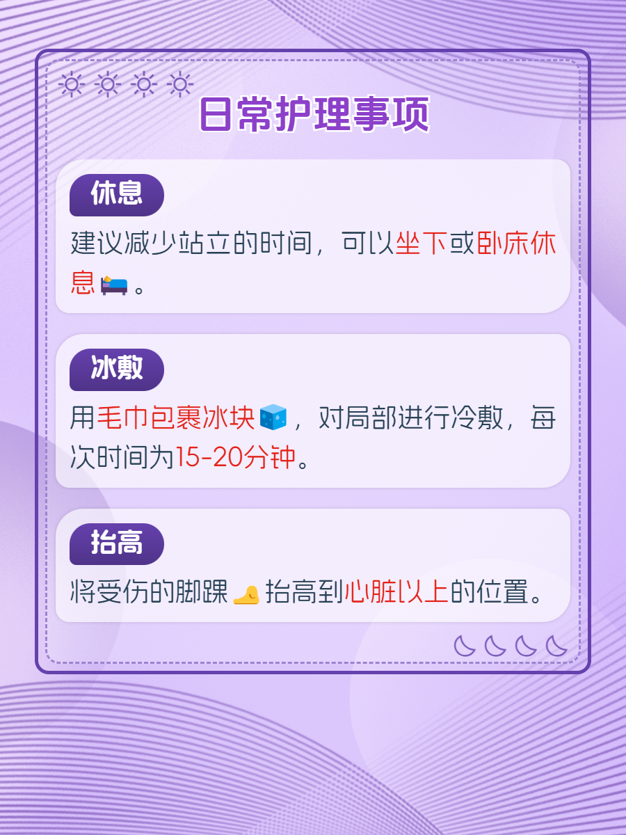 ⭐在发现脚踝肿胀后,应该立即停止运动,给予脚踝充分的休息时间,避免重复受伤或加重肿胀。