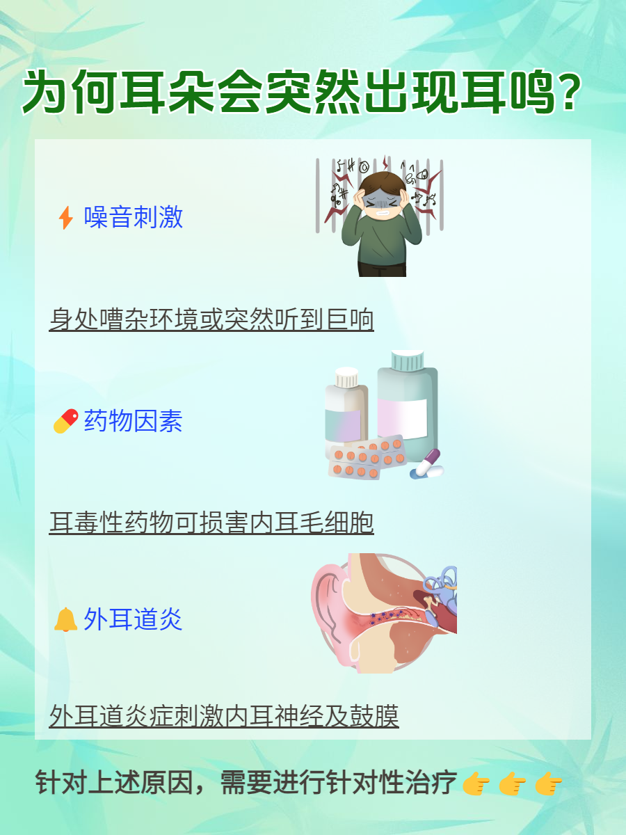 部分人群可能会有过这样的经历:耳朵突然出现耳鸣了!这个现象背后的原因较多,今天我们一起来了解一下吧👇!