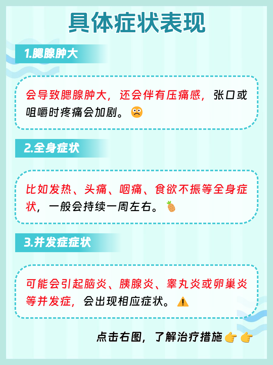 3.并发症症状:😵💫抱耳风如果得不到及时有效的治疗,还可能引发一系列并发症。这些并发症包括脑炎、胰腺炎、睾丸炎或卵巢炎等。脑炎患者可能出现高烧、头痛、呕吐、嗜睡等症状。