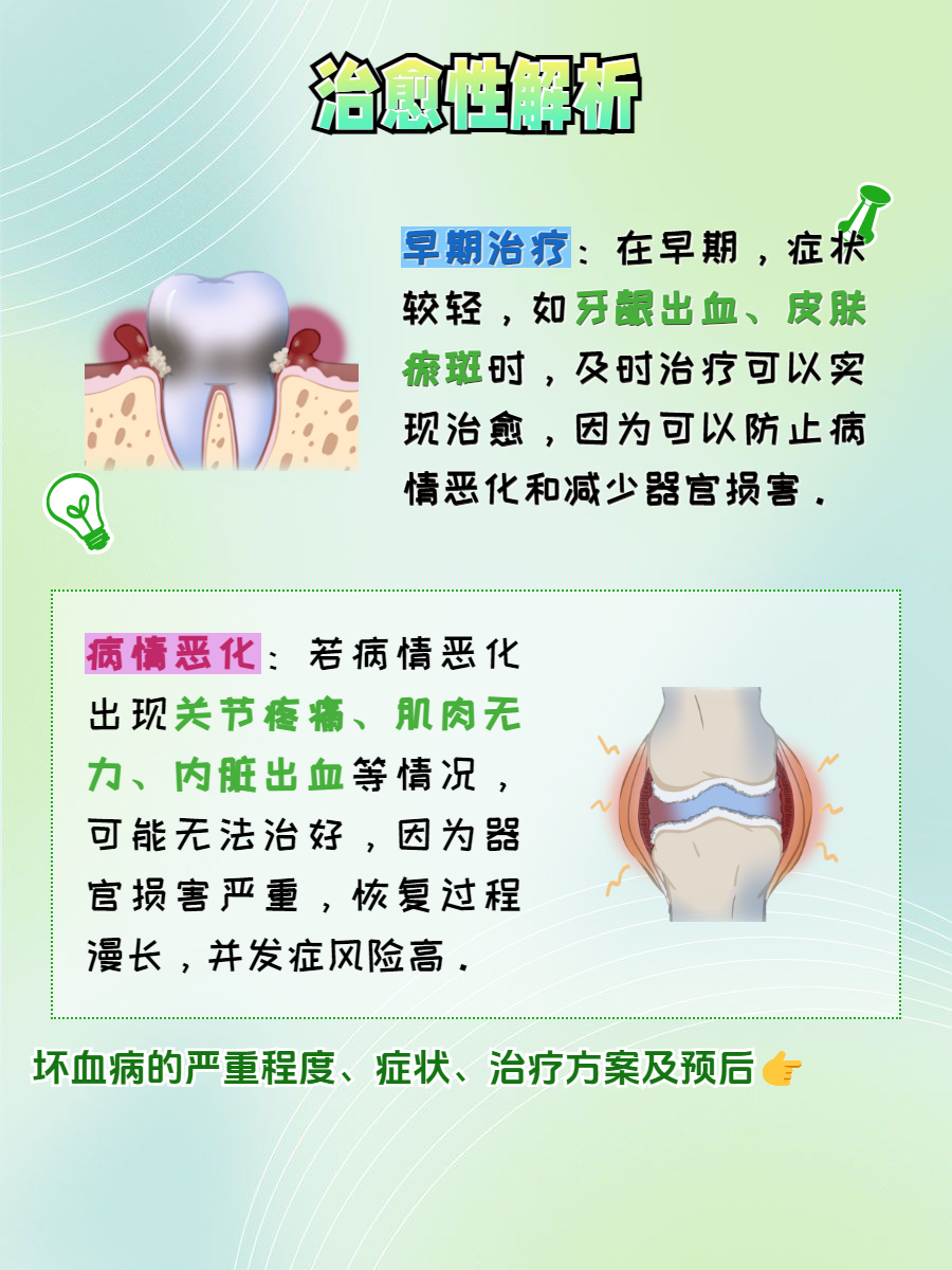🌟在坏血病的早期阶段,如牙龈出血、皮肤瘀斑等症状出现时,病情相对较轻,肾脏和其他重要器官的功能损害也较小。此时,及时治疗加以控制可以实现治愈。这是因为早期治疗能够防止病情进一步恶化,减少身体损伤,并且患者整体健康状况良好,利于维生素C的吸收和利用,使治疗反应更加积极。
