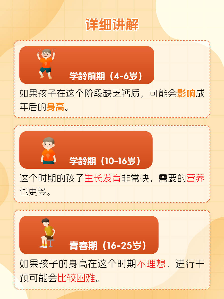 学龄前期是孩子身高发育的基础阶段。这一时期,孩子的骨骼系统处于快速发育阶段,特别是骨骼的储备期。此时,骨骼对钙元素的需求较高,如果钙元素摄入不足,可能会影响孩子的身高发育。