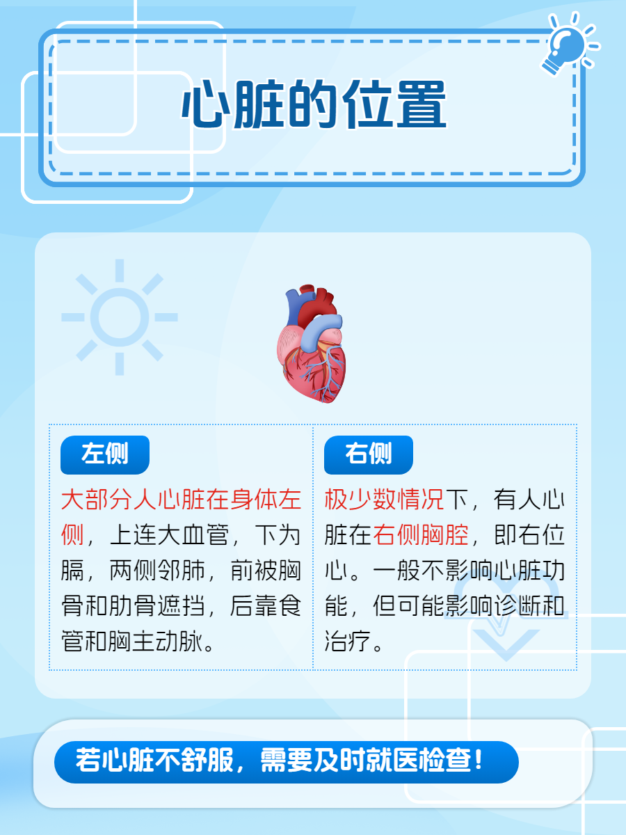 很多人对心脏的位置并不十分确定,时常会有人问起心脏在左侧还是右侧,我认为心脏大部分位于胸腔中部偏左下方,但也有极少数人心脏在右边。👇