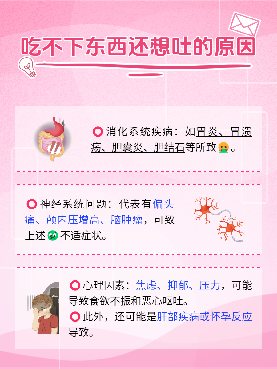 😒此外,还可能是肝部疾病或怀孕反应导致的。那么,遇到吃不下东西还想吐的情况时,需要注意些什么呢?🥰我给大家一些建议:👇比如如果症状比较轻微,可以先调整饮食,吃一些清淡易消化的食物,比如粥、面条等🍜,避免吃油腻、辛辣、刺激性的食物🌶。🙅♀️同时,要注意休息,放松心情,减轻压力🥰。