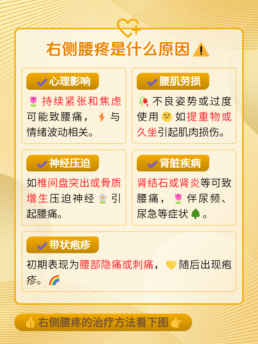🌟神经压迫:腰椎间盘突出、骨质增生等问题可能压迫到腰部神经,导致右侧腰疼。这种疼痛往往伴有麻木、刺痛等感觉异常,严重时还可能影响行走和日常生活。💪