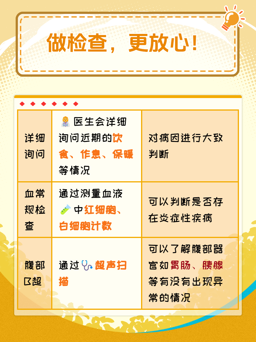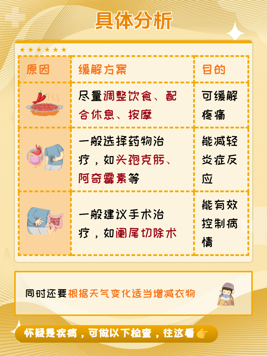 总之,腹部突然间出现疼痛,及时作出正确的应对措施,能够使疼痛感得到一定缓解✔️。治疗的时候,也应注意饮食方面的调整,不要吃太多刺激性的食物,同时还要做好保暖。