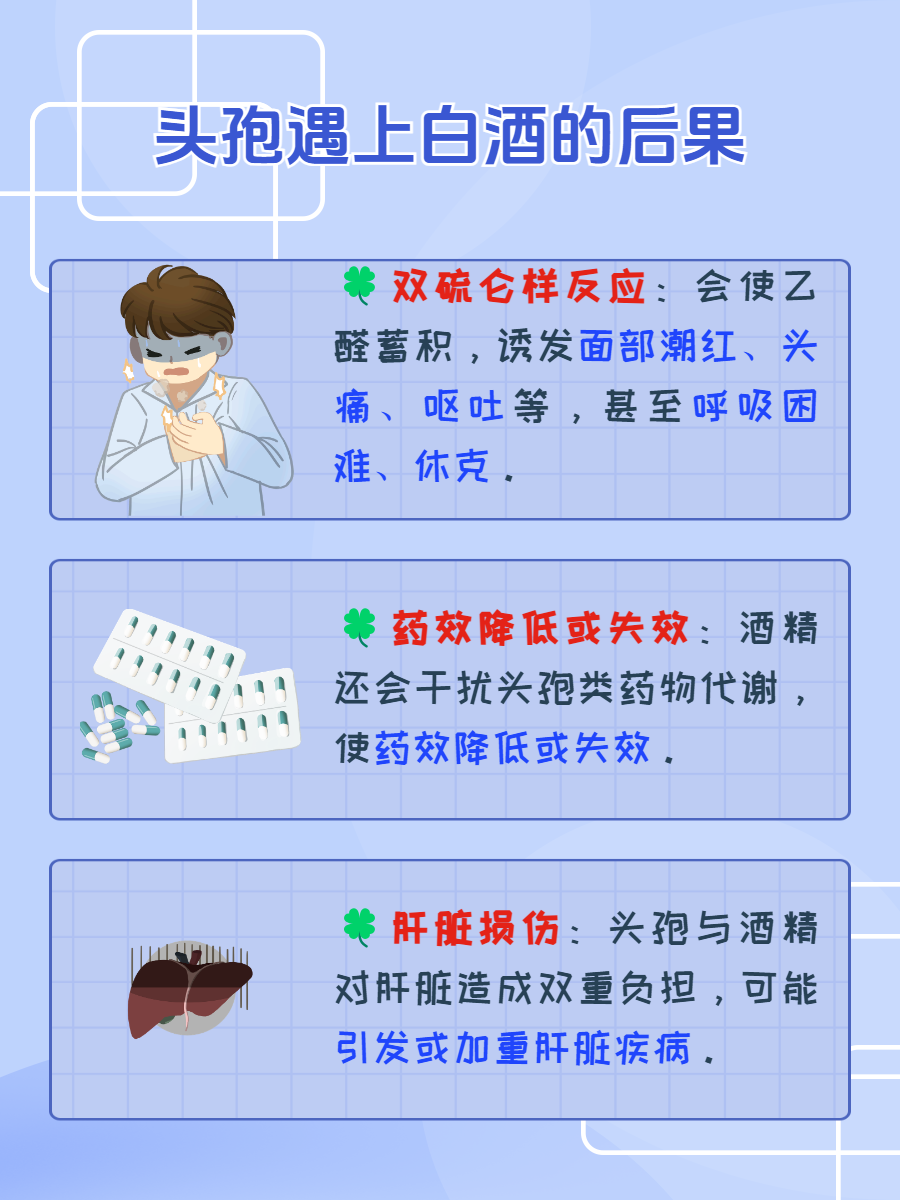 🍀综上所述,吃头孢后喝白酒的后果不容小觑,轻则身体不适,重则危及生命。