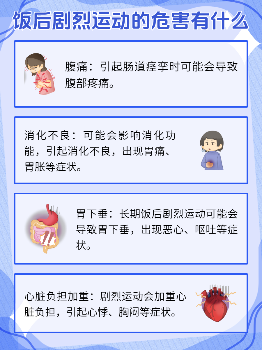 😣2、消化不良:饭后身体的大部分血液会集中在消化系统,帮助食物的消化和吸收。如果此时进行剧烈运动,血液会流向运动的肌肉💪,导致消化系统供血不足,影响消化功能,引起消化不良🤢、胃胀🤮、胃痛等症状。
