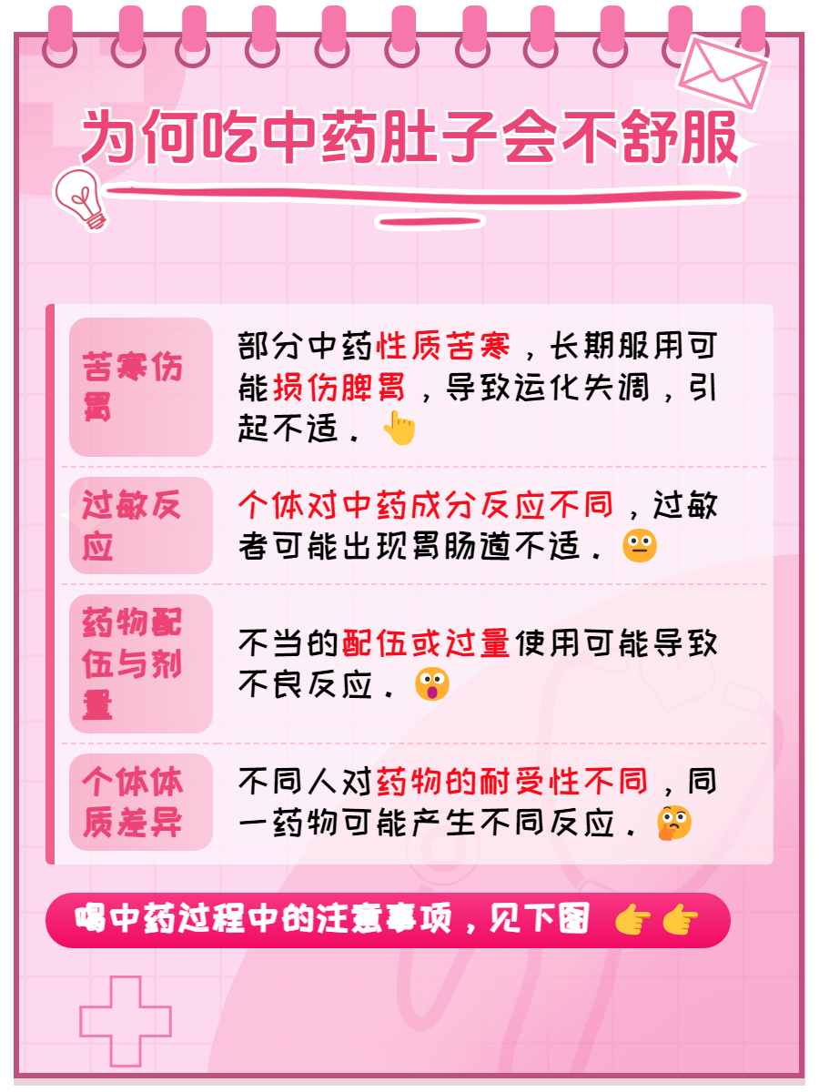 💡中药配伍复杂,不同药物间可能存在相互作用。如果配伍不当或剂量过大,也可能导致肚子不舒服。