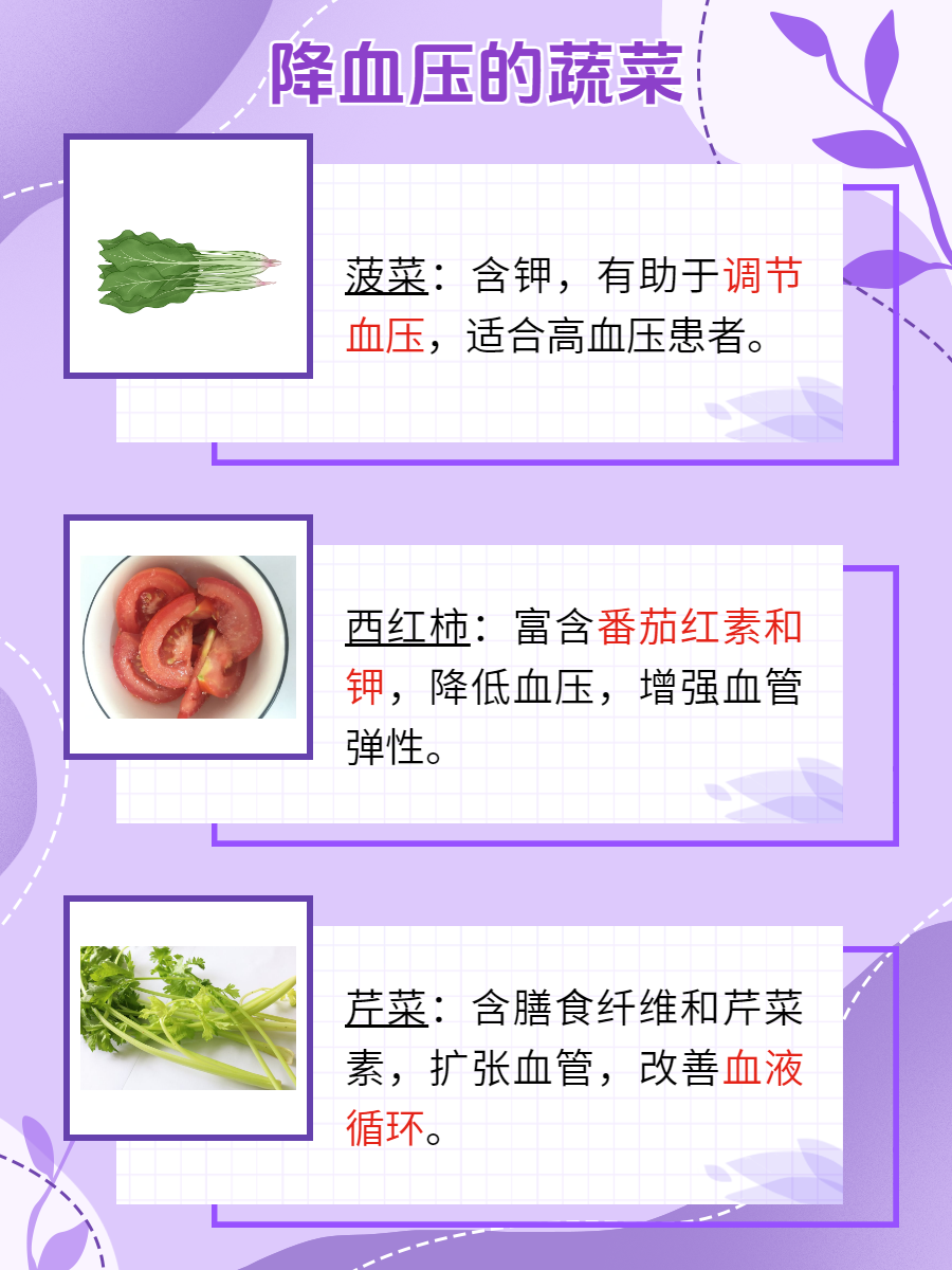 西红柿:🍅西红柿中含有丰富的番茄红素和钾,这些成分都能帮助降低血压,增强血管弹性,预防心血管疾病。❤️西红柿不仅美味,还对你的血压有很好的帮助!