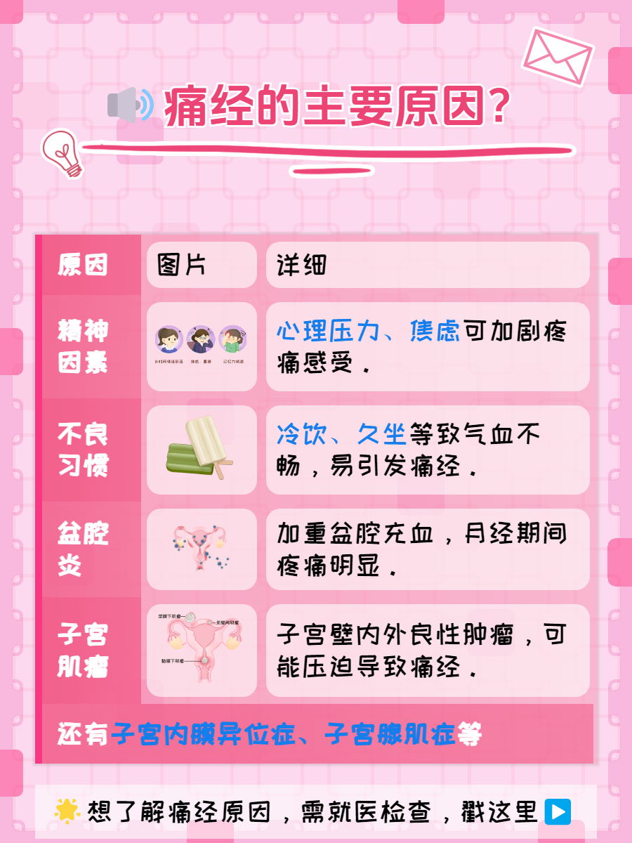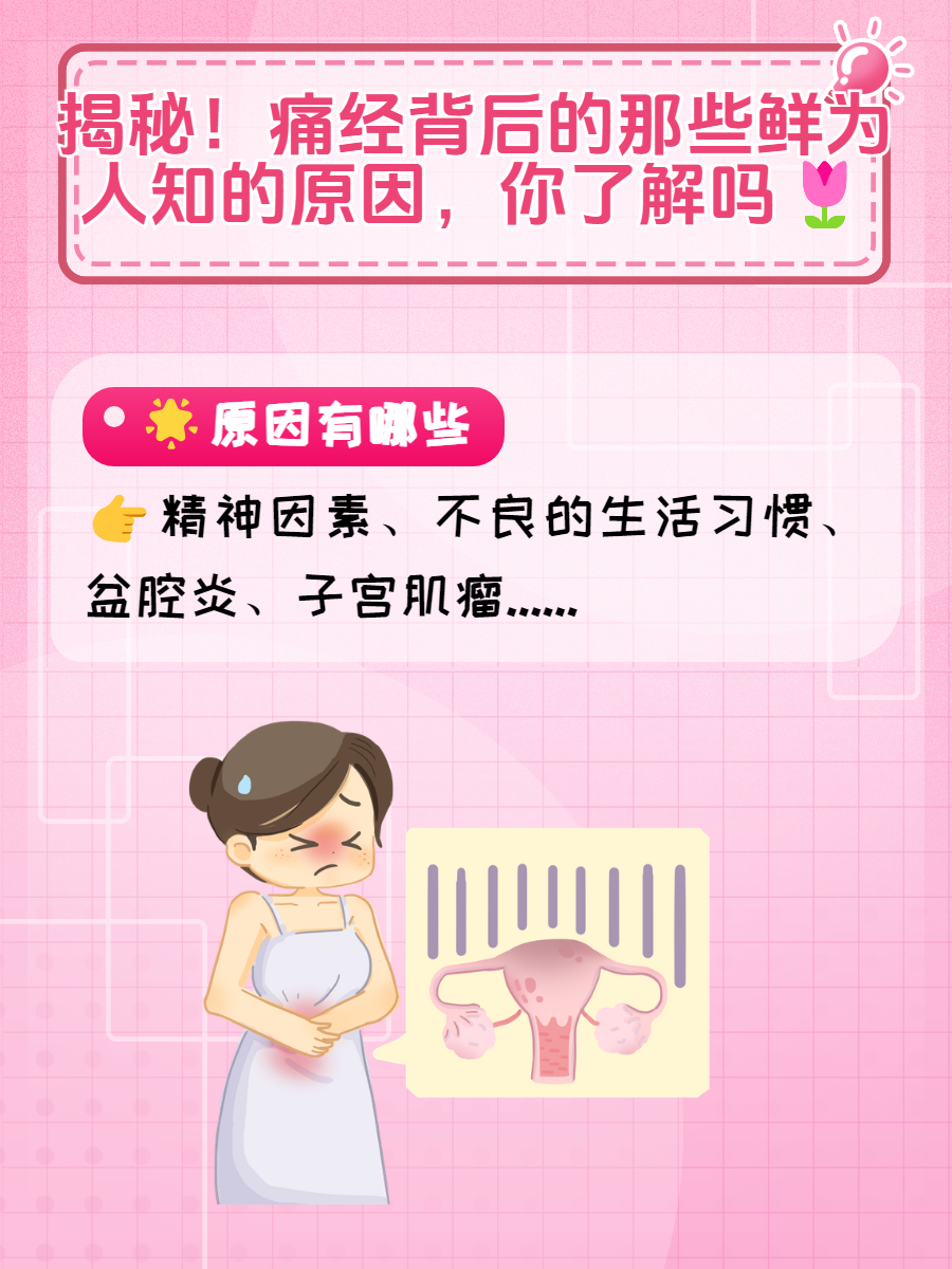 痛经是女性在月经期间或经前期出现的阴道、盆腔或下腹部的疼痛感,其原因复杂多样。今天就让我们一起来了解一下痛经的原因吧。