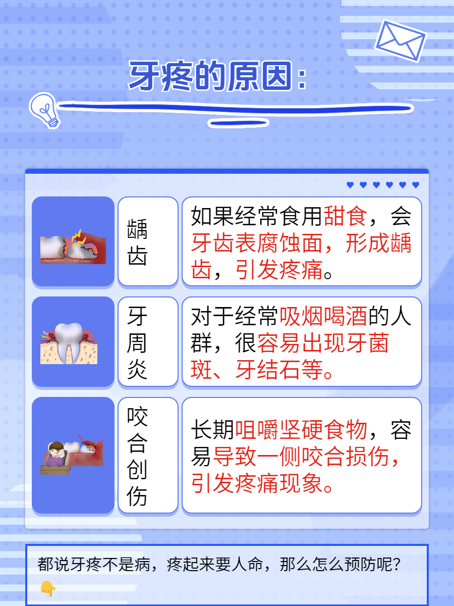 1、龋齿:如果不注意口腔卫生,细菌就会在牙齿表面逐渐侵蚀,形成龋洞。如果不及时治疗,这些小洞会越挖越深,触碰到敏感的牙髓神经,引发疼痛警报!