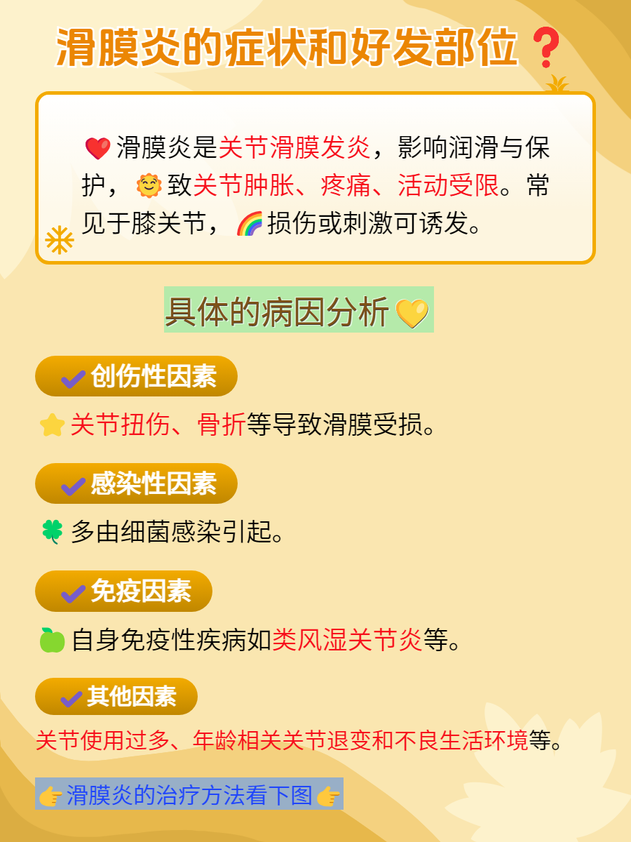 💪除了上述因素外,过度使用关节、年龄增长导致的关节退行性改变以及特定的工作环境和生活习惯等,也可能成为滑膜炎的诱因。💪
