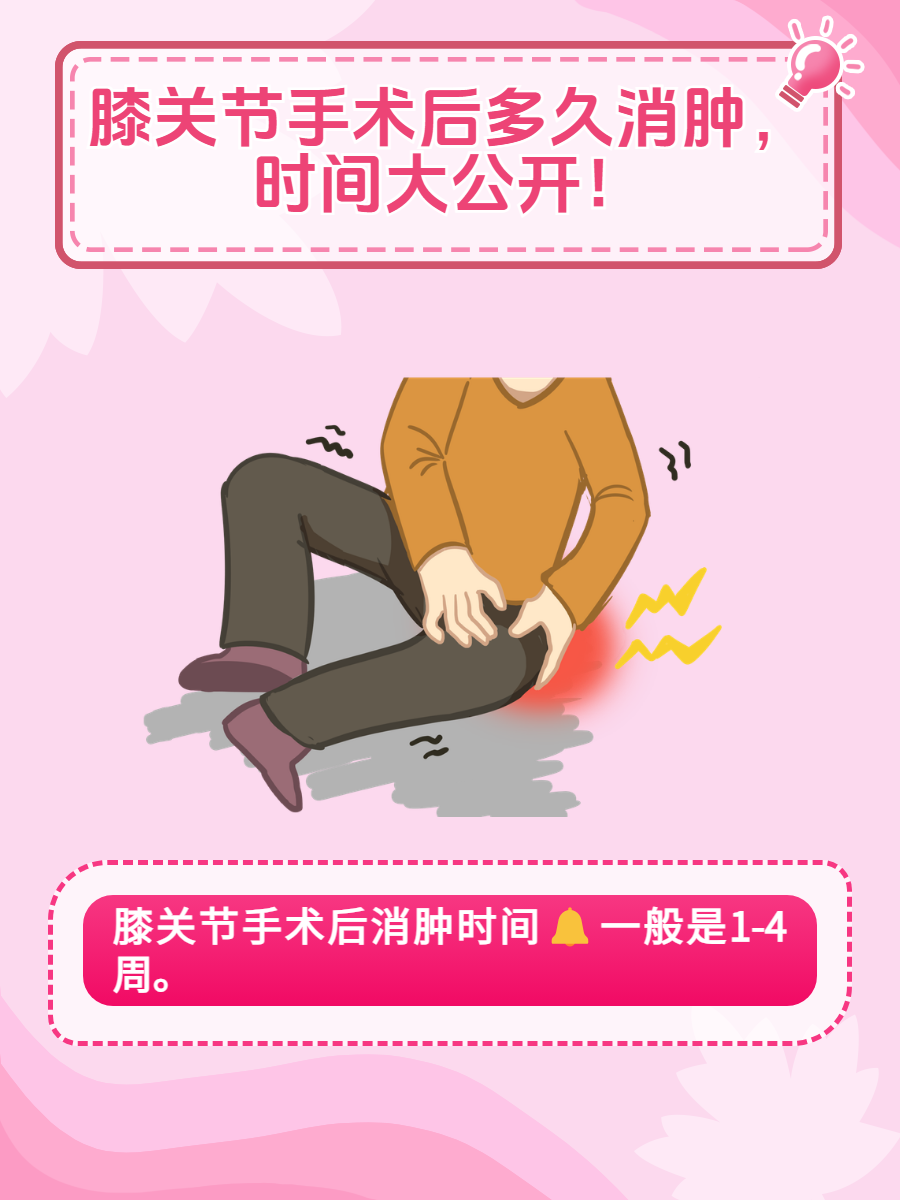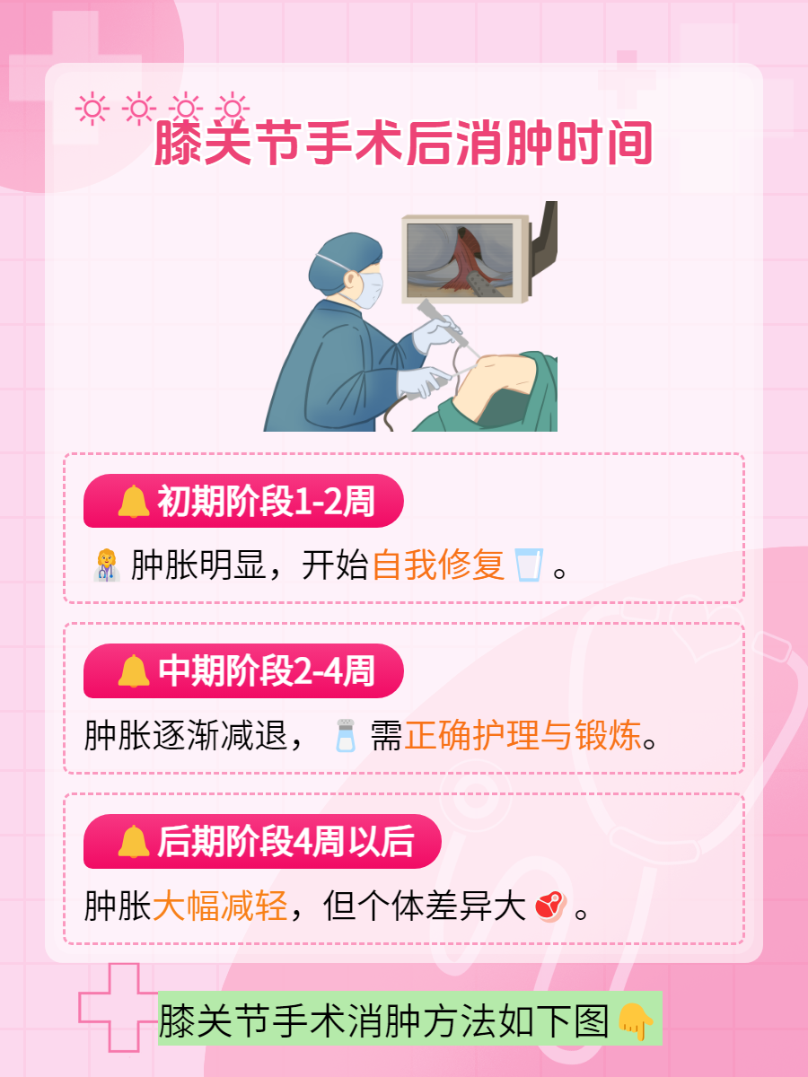 🕒一般来说,膝关节手术后的消肿时间一般是1-4周,具体情况因人而异,但大体而言,消肿过程可以划分为几个阶段: