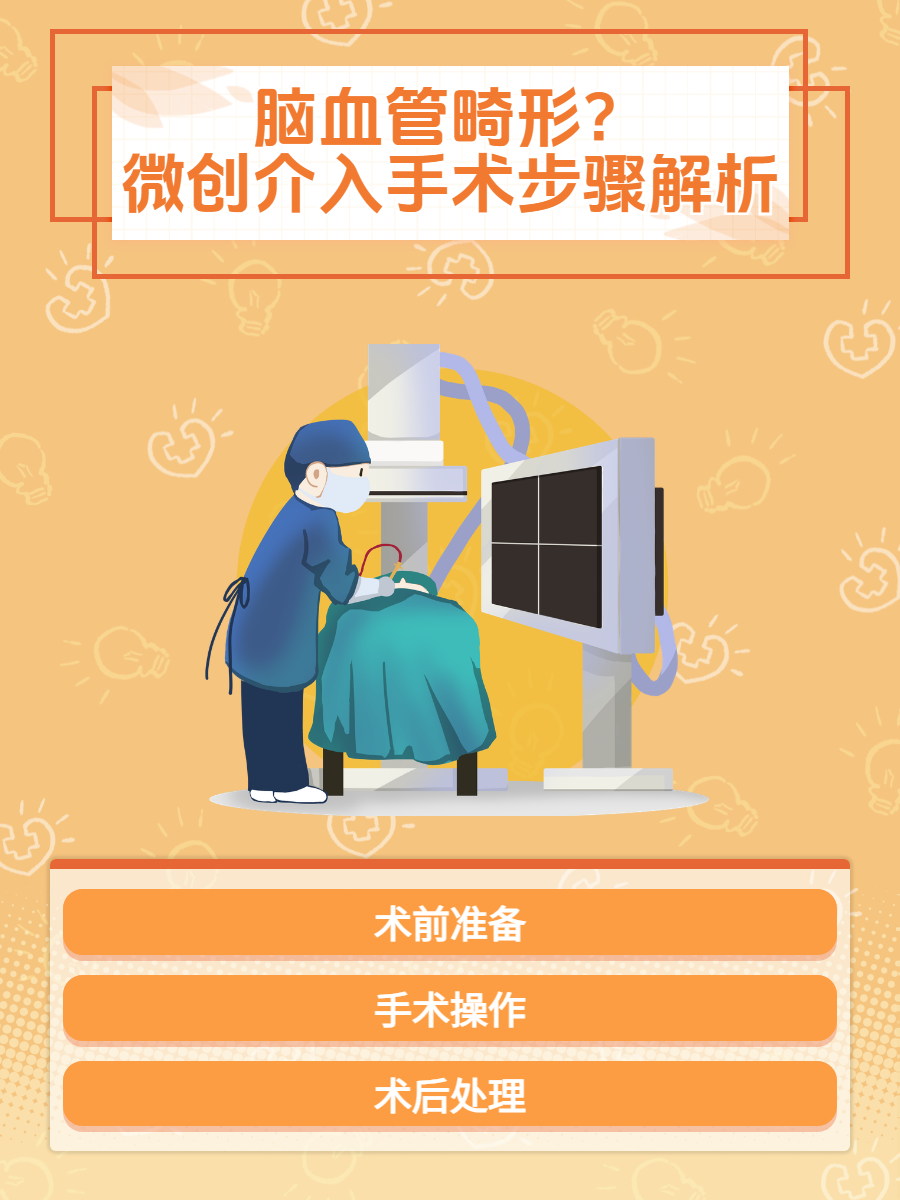 脑血管畸形介入手术是通过导管技术🔬,对异常血管进行栓塞或血管内修复的一种微创治疗方法。其基本原理是通过穿刺动脉,将导管送入血管畸形内部,填塞栓塞剂或凝固剂,使血管畸形内的空间被占满,阻止血流进入,从而达到防止血管畸形再破裂出血的目的💉。今天我们就来一起了解一下脑血管畸形介入手术的步骤吧。📅