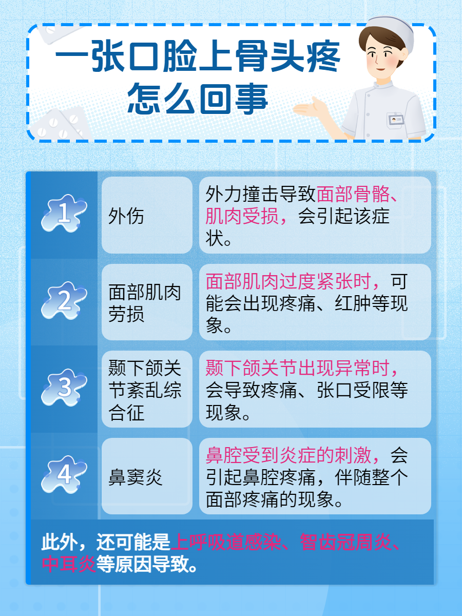 在生活中,有些人可能会遇到一张口脸上骨头就疼的情况😣,这种不适不仅影响日常生活,还可能让人感到担忧🤔,同时也会产生疑问,想弄明白引起这种症状的原因。今天,就让我来为大家分析一下这种现象的原因。