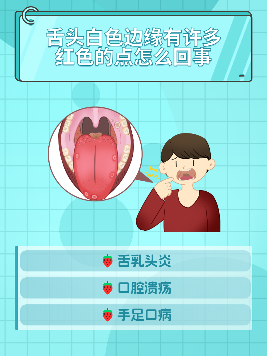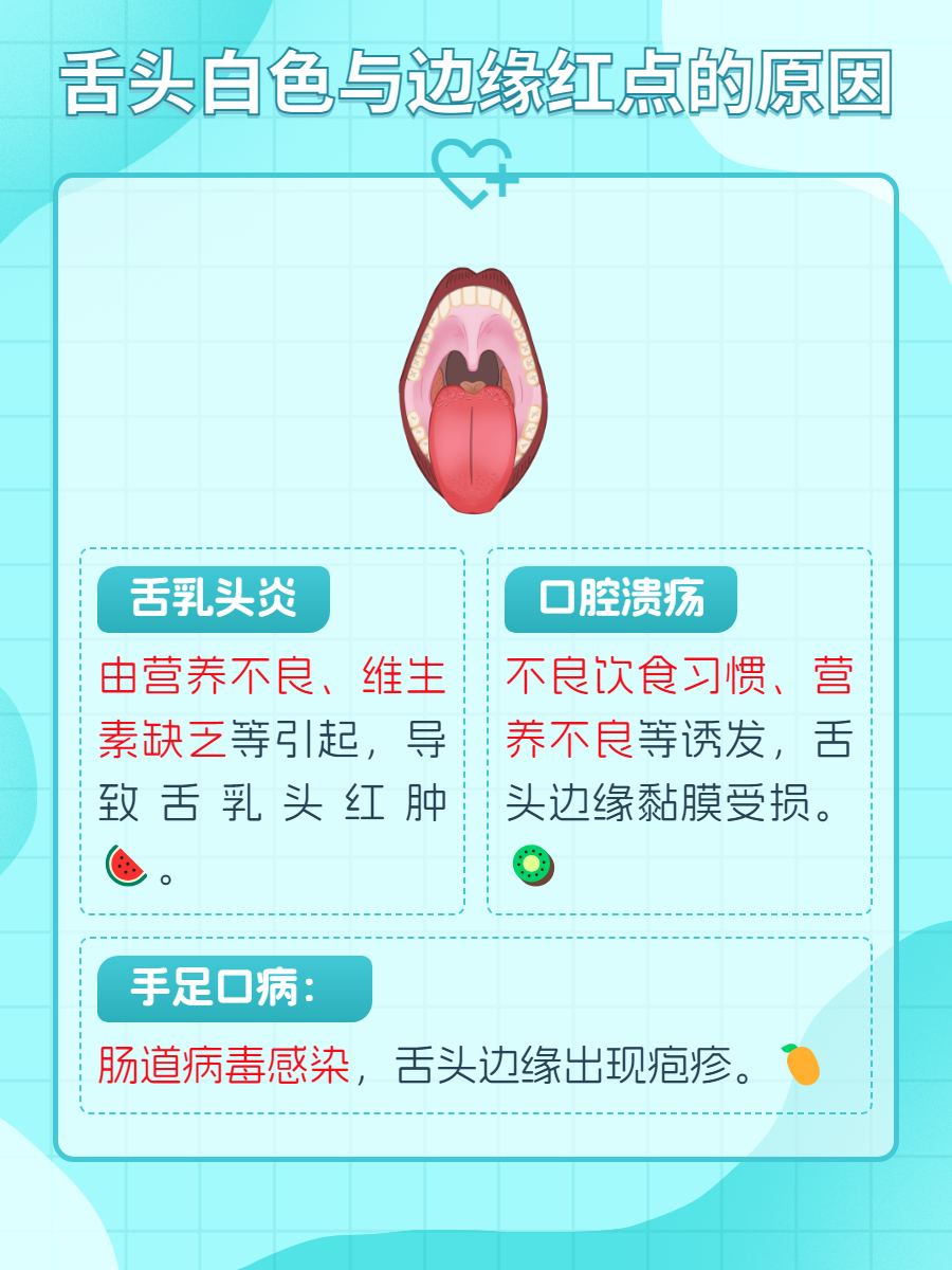 3、手足口病:一种由肠道病毒感染引起的疾病,也可能在舌头边缘引发疱疹,形成红色的点。尤其是当免疫力低下或卫生习惯不佳时,更易受到病毒的侵袭。💉