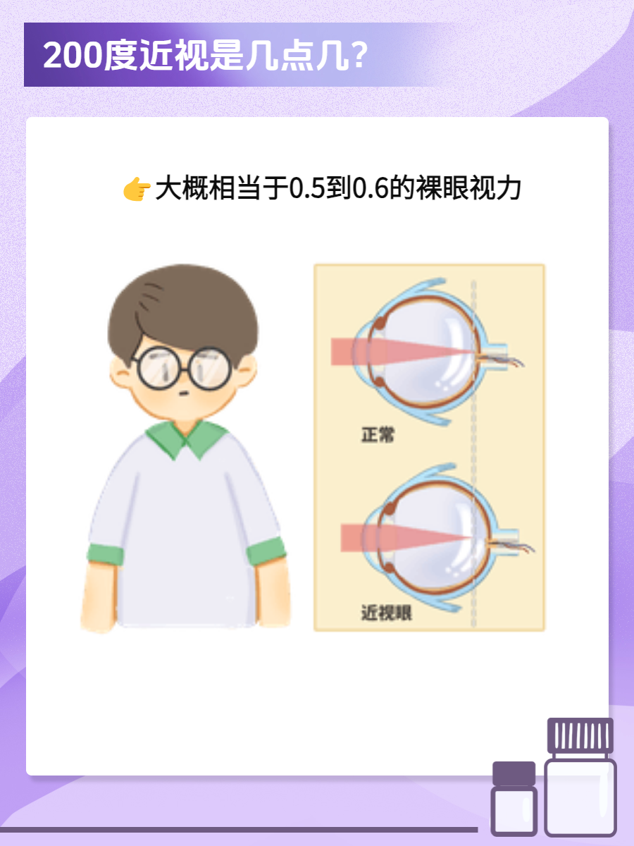 我认为,200度近视大概相当于0.5到0.6的裸眼视力,但这个结果也不是绝对的!🤔在我的经验下,它们之间的关系复杂多变。不同人的眼睛情况、测量标准以及其他眼部健康因素都会影响视力表现。🧐