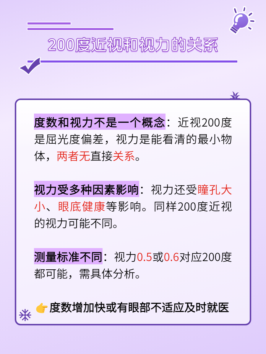 1️⃣度数和视力不是一个概念:近视200度表示眼睛的屈光度有200度的偏差,但视力是指在一定距离下能看清的最小物体大小。🔍度数和视力之间没有直接的等量关系。❌