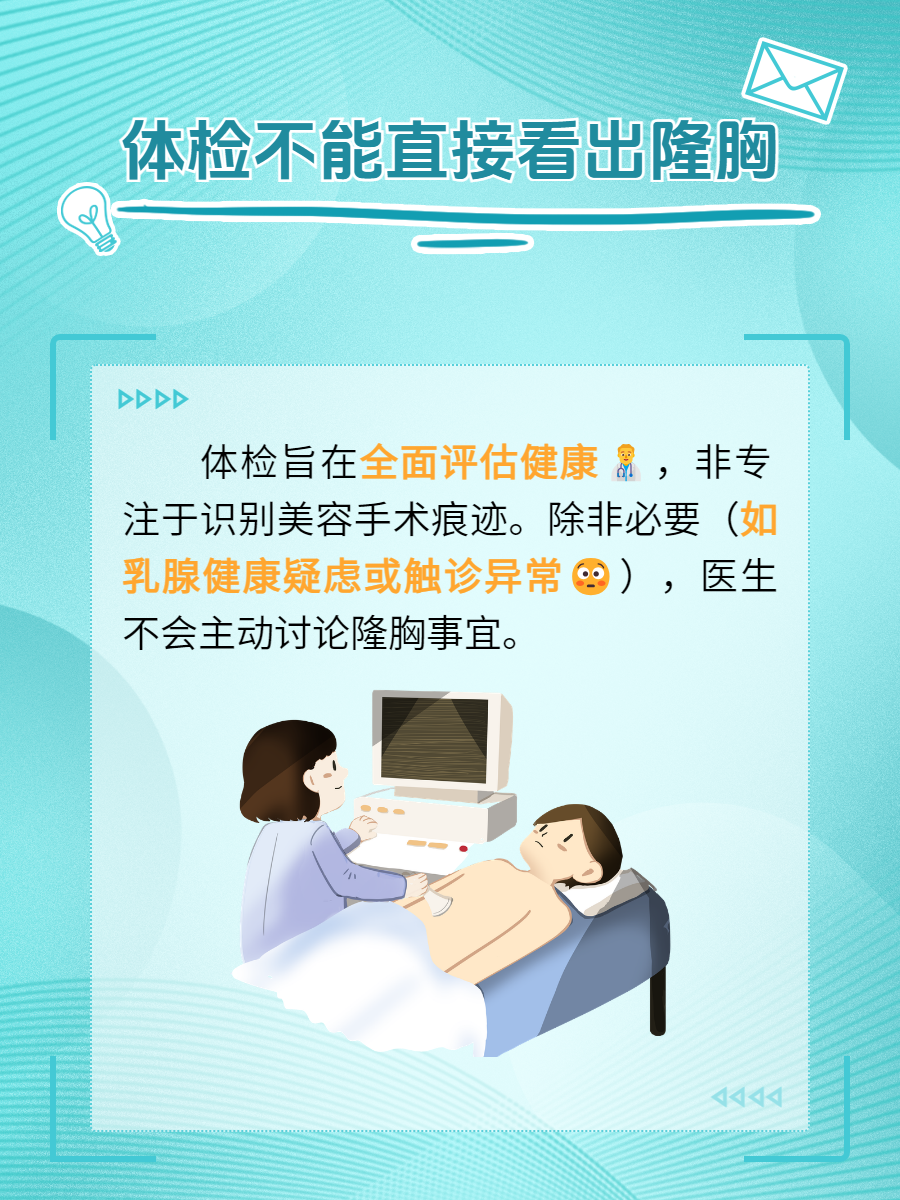 💡 体检并不能直接检测是否隆胸。除非在特定情况下,如患者有乳腺相关疾病需要进一步检查,或医生在触诊过程中发现了明显的异常,否则医生通常不会主动提及隆胸的话题。对于担心隐私泄露的求美者来说,可以选择在信任的医疗机构进行体检,并事先与医生沟通好相关事宜。🌝