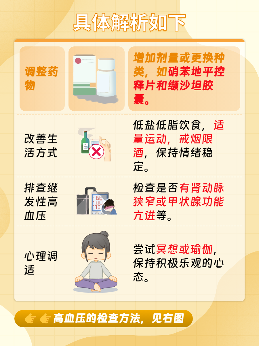 调整药物剂量或种类:每个人的体质和病情不同,对药物的反应也会有所差异。如果当前药物剂量不足以控制血压,可以在医生的指导下适当增加剂量或更换药物种类。记住,调整药物需谨慎,务必遵循医嘱。💊🔍