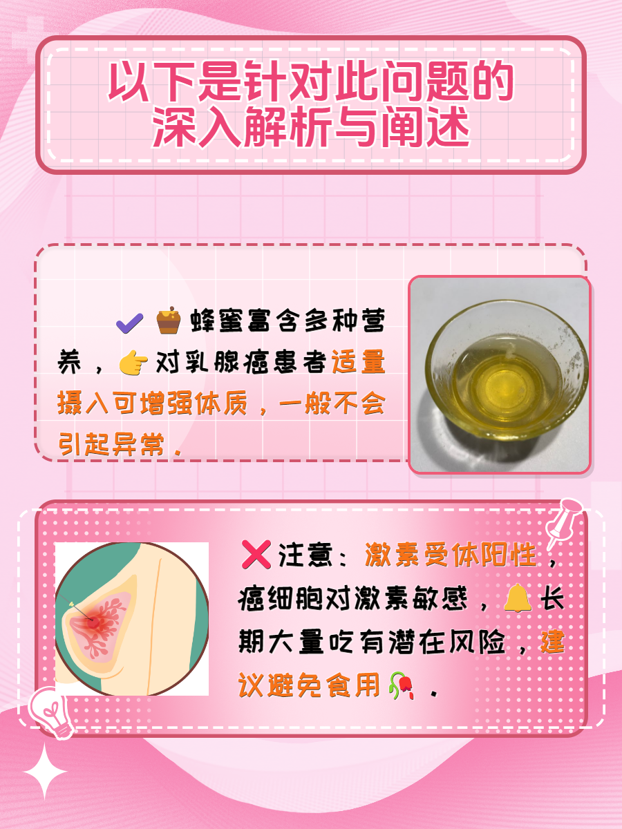乳腺癌,这一女性常见的恶性肿瘤,其饮食管理尤为关键。💪关于蜂蜜,传统观念认为其含有雌激素,可能不利于乳腺癌患者,但我认为雌激素含量极低,可以适量吃,但也需要根据具体情况考量。✨