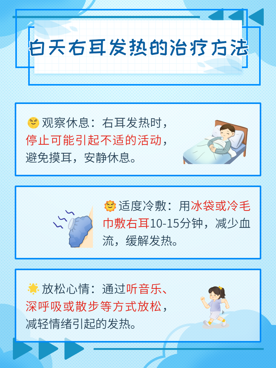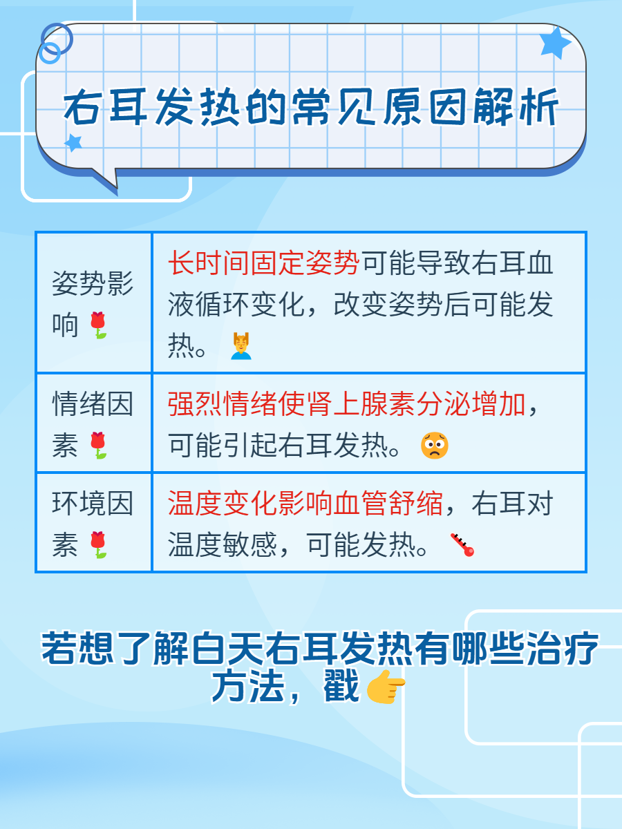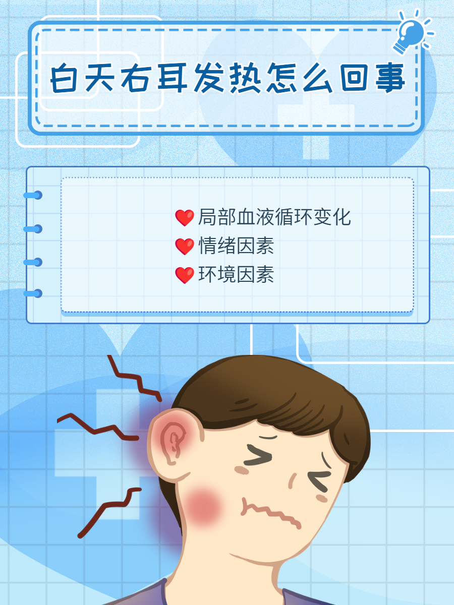 🌹3、环境因素:如果白天所处的环境温度较高,或者从寒冷的环境突然进入温暖的环境,身体为了适应温度变化,会调节血管的舒张和收缩。右耳的皮肤比较薄,对温度变化较为敏感,可能会出现发热的感觉。🌡️