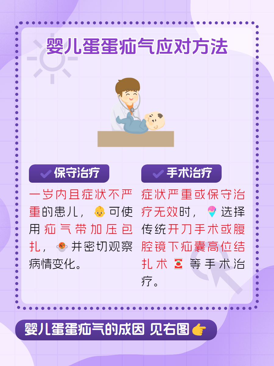 手术治疗👏:如果婴儿蛋蛋疝气症状严重或保守治疗无效,我推荐应及时进行手术治疗。手术方式包括传统的开刀手术和腹腔镜下的疝囊高位结扎术等。手术治疗可以有效解决疝气的根本问题,避免病情反复发作和可能出现的并发症。💖
